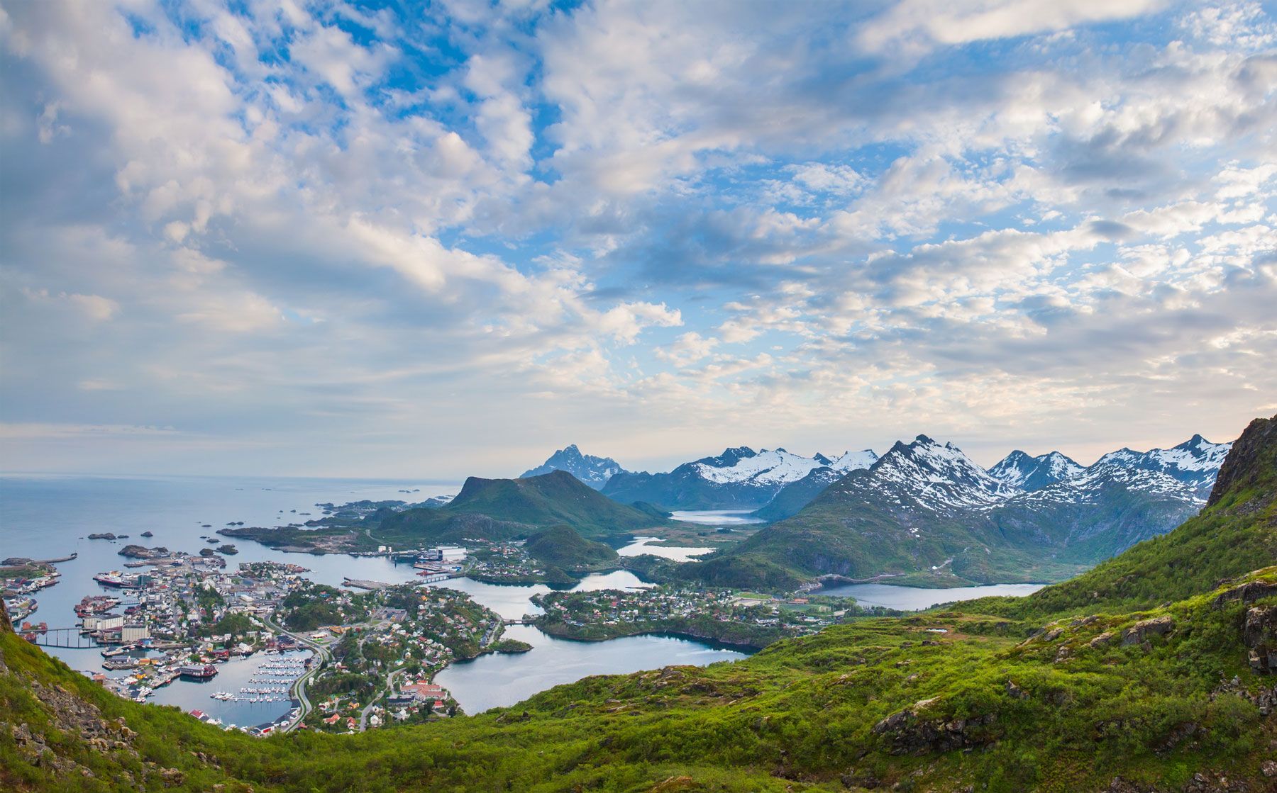Durch die nordnorwegische Küstenlandschaft geht es weiter nach Süden. Von Bjerkvik fahren Sie über die Insel Hinnoya und den Raftsund in die herrliche Inselwelt der Lofoten. Hier erwarten Sie steil aufragende Berge, offene See, weiße Strände und malerische Fischerdörfer. In Svolvaer erleben Sie nach dem Abendessen die Mitternachtssonne zwischen grandiosen Bergspitzen.